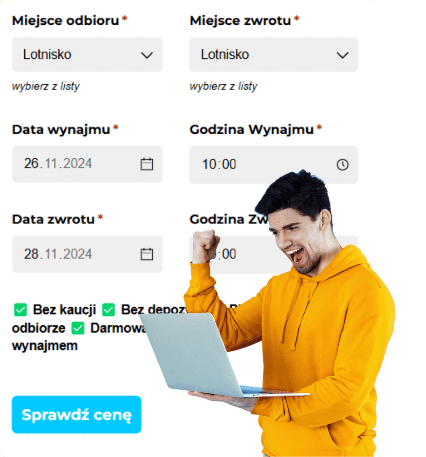Instrukcja odbioru samochodu znajdziesz w swoim potwierdzeniu, prześlemy Ci ją również na dzień przed obiorem. Pamiętaj, że samochód możesz odebrać i zwrócić, gdzie tylko chcesz. Wystarczy, że wybierzesz te miejsa w swojej rezerwacji.